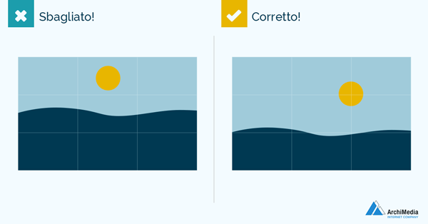 Si tratta di una regola molto semplice che consiste nel suddividere l'immagine in 9 riquadri ottenuti tracciando due linee orizzontali e due verticali equidistanti, come da immagine.