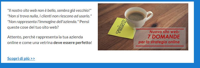 Ma non è tutto: se vuoi veramente che il tuo sito ti aiuti a trovare nuovi clienti online, ci sono altri elementi che non devi assolutamente dimenticare. Poichè ci siamo accorti che molte aziende sottovalutano questo aspetto, abbiamo scritto un'intera guida per aiutarli a migliorare il sito e risolvere questo problema. Clicca qui sotto e scarica la guida, è completamente gratuita!