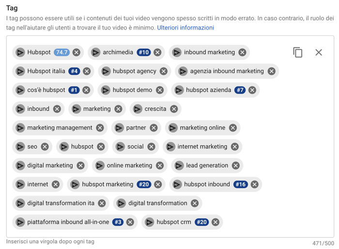 È questa l’attività che fa davvero la differenza nell’ottimizzazione del video. Usa i tag per selezionare tutte le possibili keyword con le quali vorresti posizionare il contenuto. Qui, diversamente dalle kw per il canale, dovrai essere molto più esaustivo e specifico.