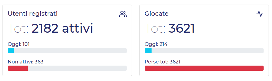 Gli utenti non attivi sono quelli che non hanno ancora confermato la propria email e fatto il primo login per giocare. Solo questa mattina (sto scrivendo questo blog post e sono le 11:25) si sono registrati 101 nuovi contatti e hanno già giocato 214 volte.